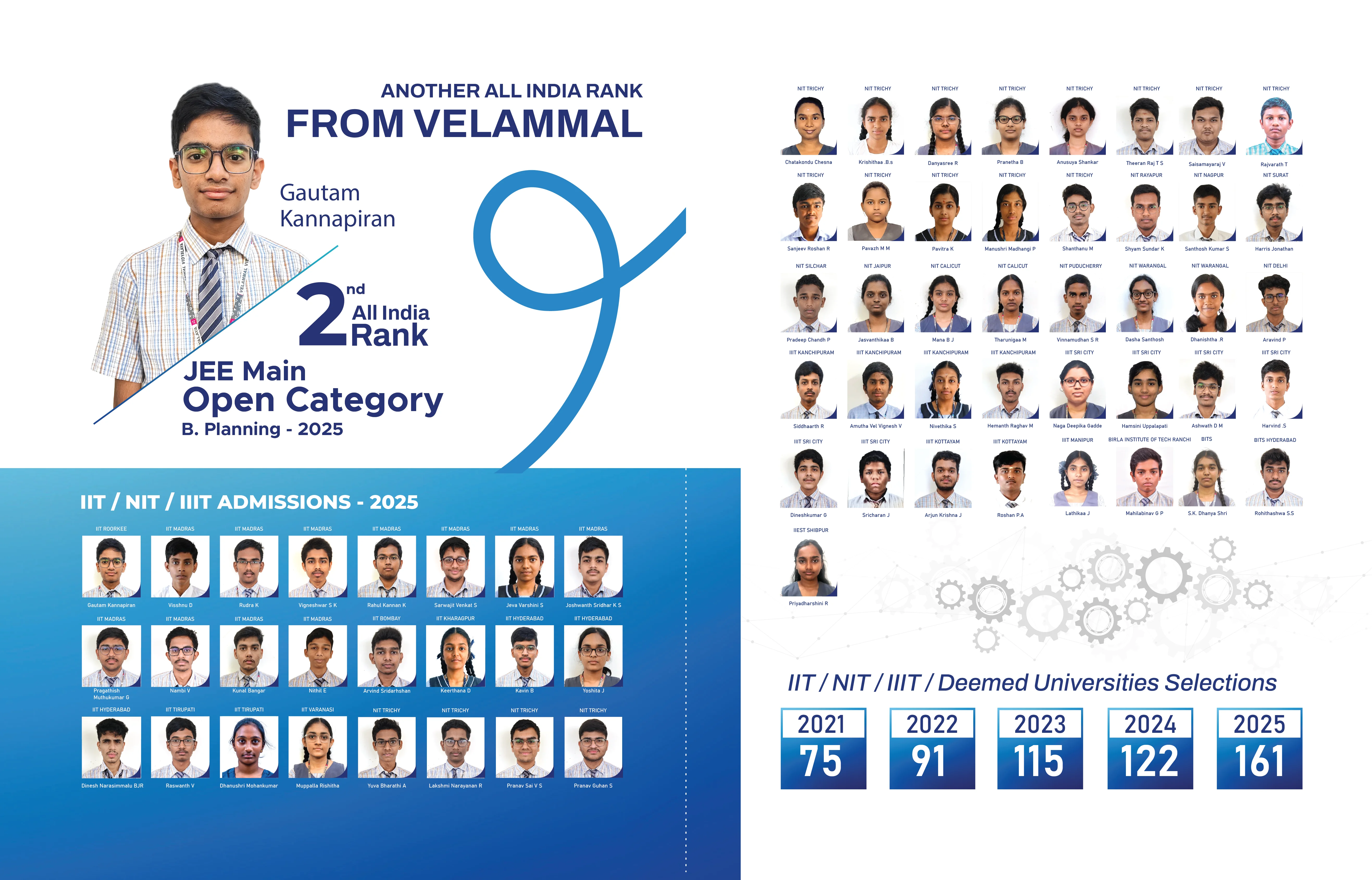 At Velammal, we understand that success is a journey of constant improvement. With a proven history of transforming concepts into tangible outcomes, we cultivate an immersive and enriching educational journey. We are dedicated to nurturing, caring for, and supporting your children's growth. It's no wonder we've earned a place of pride among the top educational institutions in the nation! Velammal's wealth of experience and expertise have earned us the distinction of Perfect Educators.