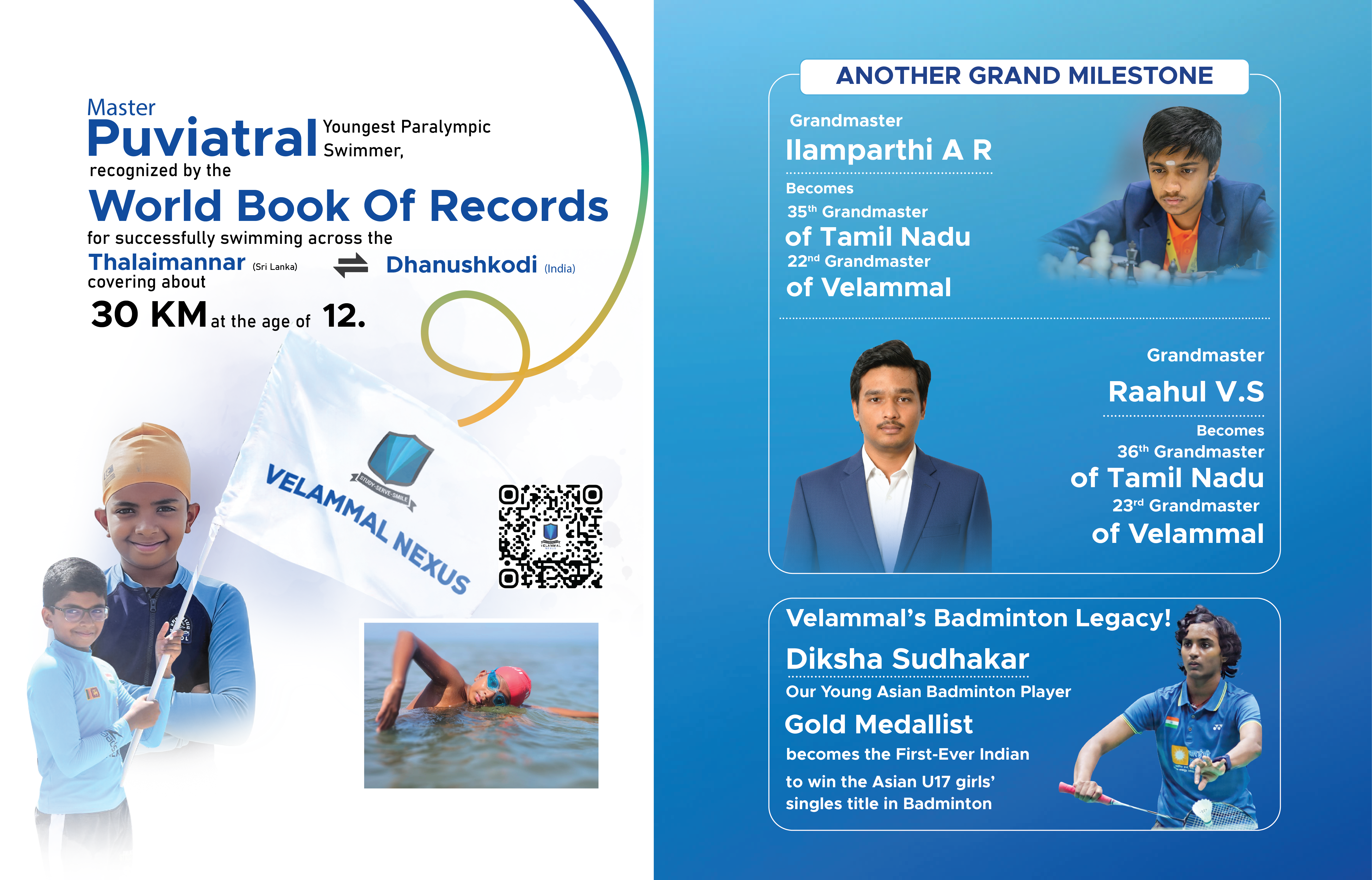 Since its inception in 1986, Velammal started as a business venture in Mogappair with 183 students and 13 teachers. Over time, it has evolved into a beacon of social responsibility, distinguishing itself in an era of commercialized education. We are committed to crafting enriching learning experiences that empower our students with essential skills, valuable habits, and admirable character attributes. Our acclaimed learning and life skills system has inspired and influenced education across India and the region for decades. Like a caterpillar that transforms into a butterfly, we encourage our students to embrace their full potential and remain driven.